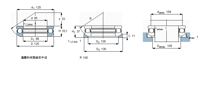 | 推力球軸承, 單向,帶球面軸承座墊圈 | ||||||||||||