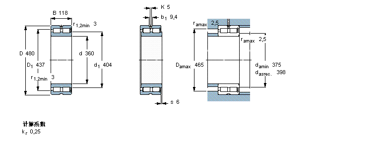 圓柱滾子軸承, 雙列滿裝滾子, 無密封件, 單方向軸向負(fù)荷的擋邊